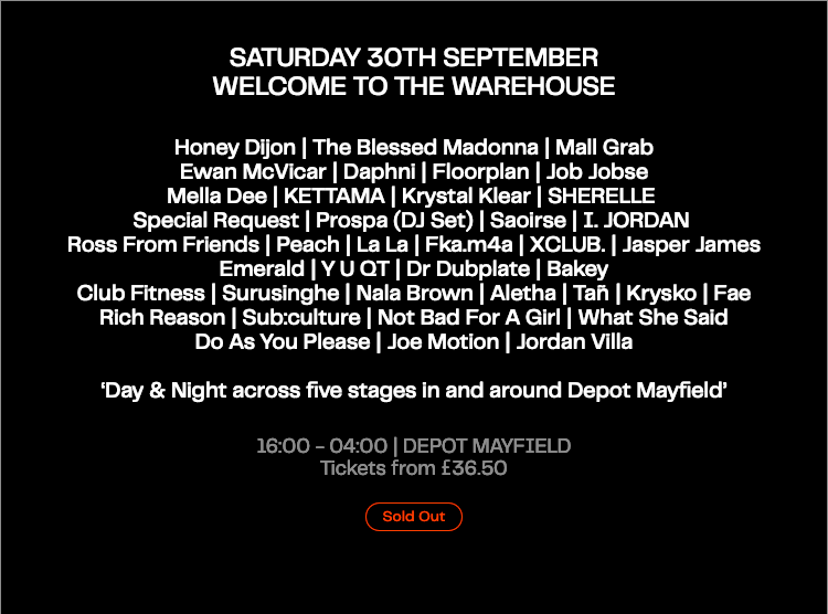 The last time I was in the “Rainy City” I made sure to get a glimpse of the Depot Mayfield, the Warehouse Project’s current home, and was immediately blown away by the size of it. I remember thinking it looked like a city. So, when the opportunity arose to go, I couldn’t resist.